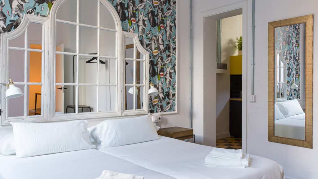 A modern room in a historical building. Very high ceilings, big windows and various mirrors give it a beautiful air